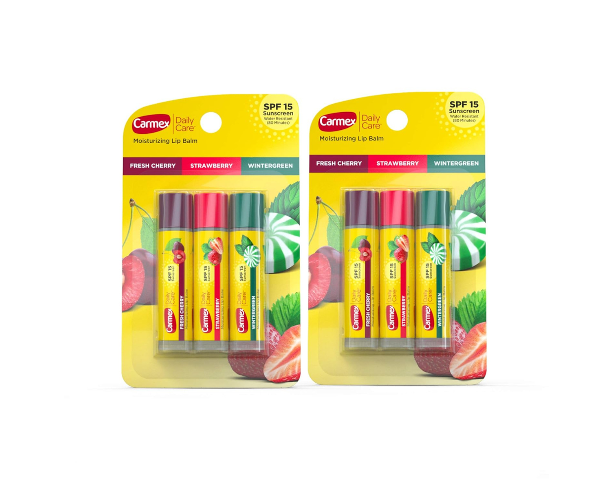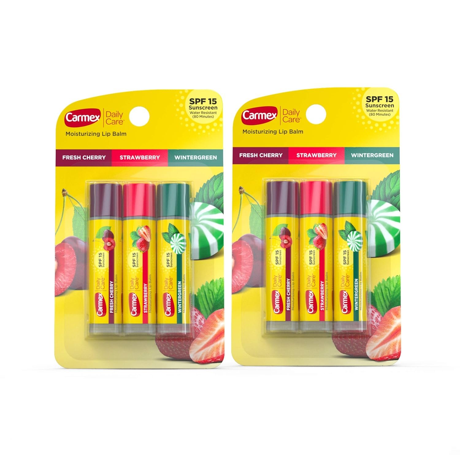 Carmex Daily Care Moisturizing Lip Balm Sticks with SPF, Fresh Cherry, Strawberry and Wintergreen Lip Balm Pack, 0.15 Oz, 3 Count (2 Pack)