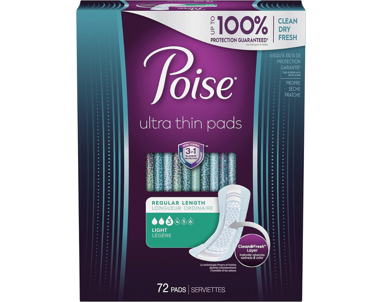 Poise Ultra Thin Incontinence Pads for Women, Light Absorbency, Regular Length, 72 Count